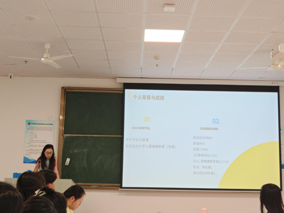 随后,张悦航围绕考研全流程展开,从择校可借助公式,结合报录比、参考书等进行考量,到复试要准备好简历,保持好心态,面试时语言流畅且真诚并注重礼仪细节。最后,她以“闷声耕作,春天看得见”这句话与大家共勉。