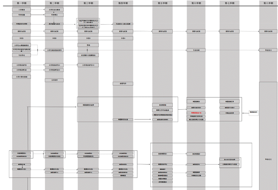 初级韩国语,中级韩国语,高级韩国语,韩国语读写,韩国语写作,韩国语视听说,韩国语会话,汉韩翻译理论与实践,朝鲜-韩国概况,韩国语语法,对韩经贸理论与实务,韩国文学概论,中韩跨文化交际